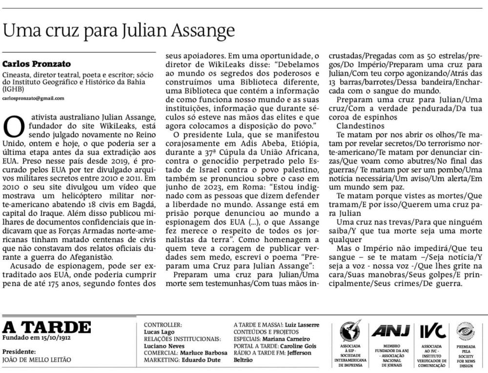 O presidente Lula, que ontem se manifestou corajosamente em Adis Abeba, Etiópia, durante a 37ª Cúpula da União Africana, contra o genocídio perpetrado pelo Estado de Israel contra o povo palestino, também se pronunciou sobre o caso em junho de 2023, em Roma: “Estou indignado com as pessoas que dizem defender a liberdade no mundo. Assange está em prisão porque denunciou ao mundo a espionagem dos EUA (…) O que Assange fez merece o respeito de todos os jornalistas da terra”. Como homenagem a quem teve a coragem de publicar verdades sem medo, escrevi o poema “Preparam uma cruz para Julian Assange”: