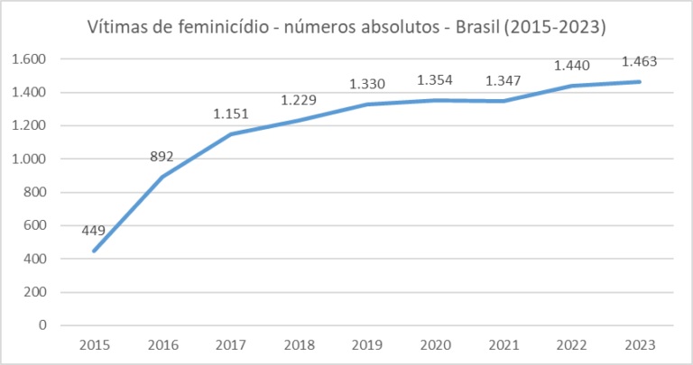 De acordo com o levantamento produzido pelo FBSP, em 2023, 1.463 mulheres foram vítimas de feminicídio no Brasil, taxa de 1,4 mulheres mortas para cada grupo de 100 mil, crescimento de 1,6% comparado ao mesmo período do ano anterior, e o maior número já registrado desde a tipificação da lei[2].