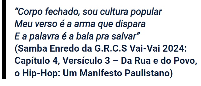 “Vale ressaltar que, neste recorte histórico da década de 90, a segurança pública no estado de São Paulo era uma questão importante e latente, com índices altíssimos de mortalidade da população preta e periférica. Além disso, é de conhecimento público que os precursores do movimento hip hop no Brasil eram marginalizados e tratados como vagabundos, sofrendo repressão e sendo presos, muitas vezes, apenas por dançarem e adotarem um estilo de vestimenta considerado inadequado para a época. O que a escola fez, na avenida, foi inserir o álbum e os acontecimentos históricos no contexto que eles ocorreram, no enredo do desfile”.