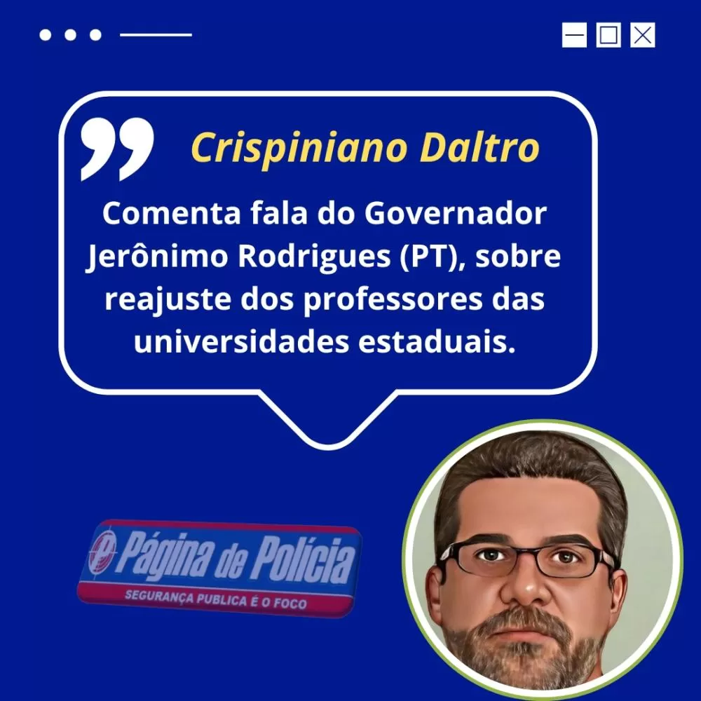 CRISPINIANO DALTRO - Administrador, Pós graduado em Gestão Pública de Municípios pela Universidade do Estado da Bahia (UNEB), Coordenador e professor do curso de Investigador Profissional ministrado pela Facceba, Investigador Policial Civil, ativista dos movimentos sociais, ex-Presidente do Sindicato dos Policiais Civis do Estado da Bahia - SINDPOC e ex-Coordenador Geral da Federação dos Trabalhadores Público do Estado da Bahia - FETRAB.