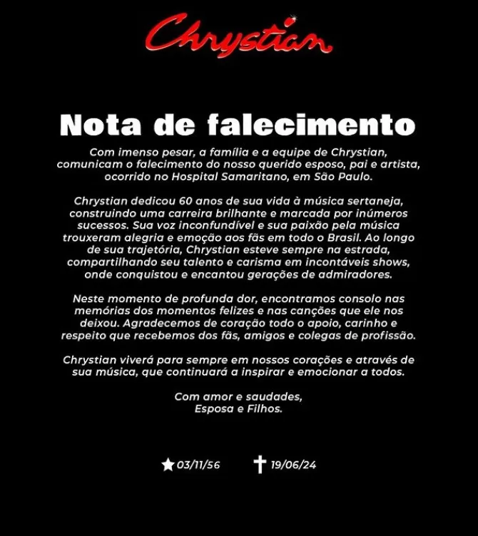 Em nota, a família lamentou a partida do artista e relembrou seu amor pela música, profissão que abraçou ainda na infância. "Com imenso pesar, a família e a equipe de Chrystian comunicam o falecimento do nosso querido esposo, pai e artista, ocorrido no Hospital Samaritano, em São Paulo. Chrystian dedicou 60 anos de sua vida à música sertaneja, construindo uma carreira brilhante e marcada por inúmeros sucessos. Sua voz inconfundível e sua paixão pela música trouxeram alegria e emoção aos fãs em todo o Brasil", diz o comunicado.