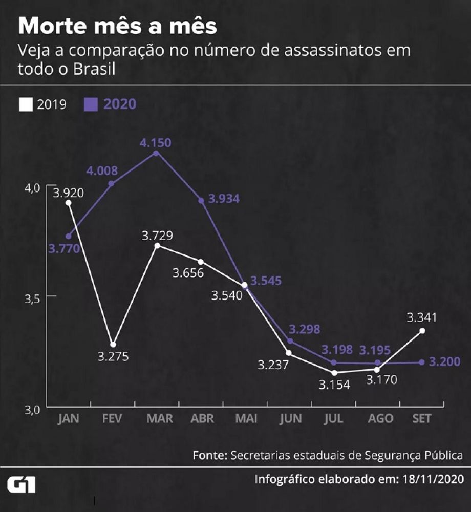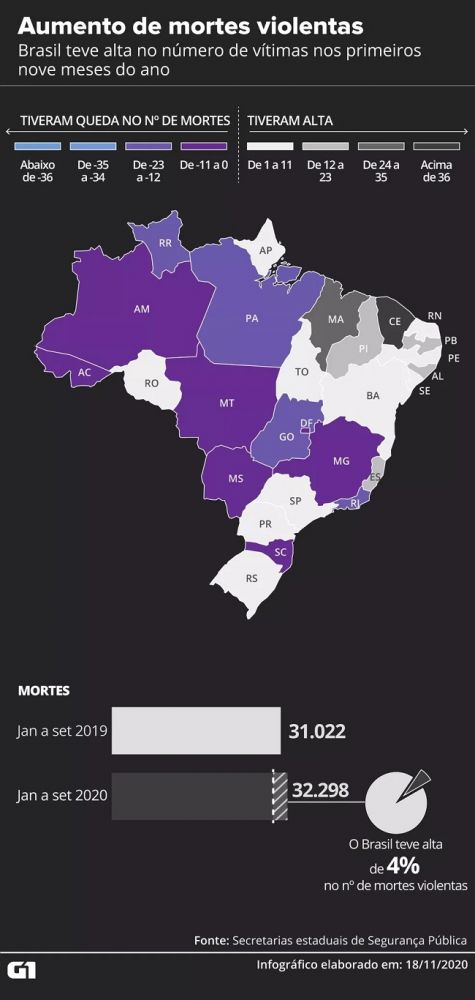 O aumento de mortes acontece mesmo durante a pandemia do novo coronavírus, que fez com que estados adotassem diversas medidas de isolamento social em grande parte do ano. Ou seja, houve alta na violência mesmo com menos pessoas nas ruas.