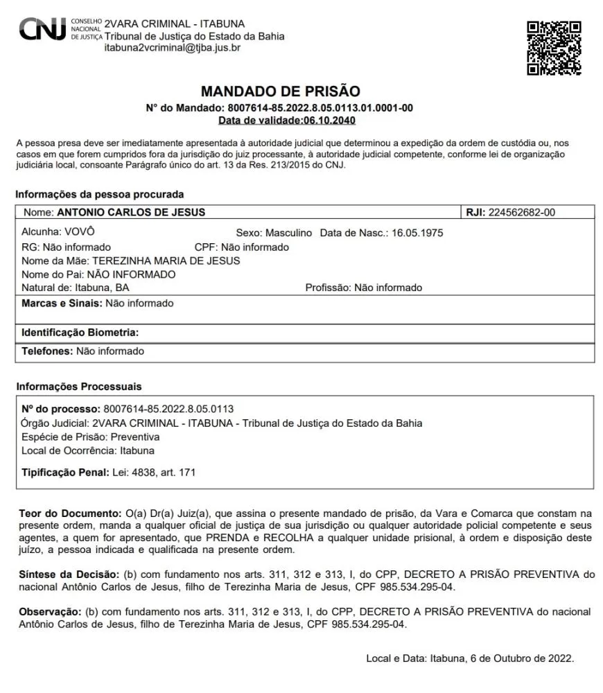 A Guarnição Alpha, integrada pelos policiais militares Paulo Sérgio, Magno, Silveira, Simões e Toledo da OPERAÇÃO MIGUEL PEREIRA PRESENTE, após receber informações sobre um estelionatário procurado pela justiça da Bahia, iniciou diligências e realizou a abordagem do mesmo. Confirmada a existência do mandado de prisão contra o foragido por violação do artigo 171 da Lei 4.838, ele foi conduzido à 96ª DP e apresentado ao inspetor Diego, matrícula 50330160, onde foi identificado e constatada a existência de um Mandado de Prisão nº 8007614-85.2022.8.05.0113.01.0001-00, expedido pela justiça da cidade de Itabuna, no interior da Bahia.