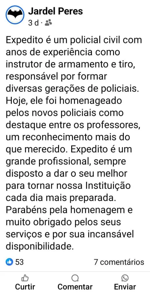 Durante a homenagem, foi enfatizado o impacto da dedicação e competência de Expedito Junior no aprimoramento da formação dos policiais civis.