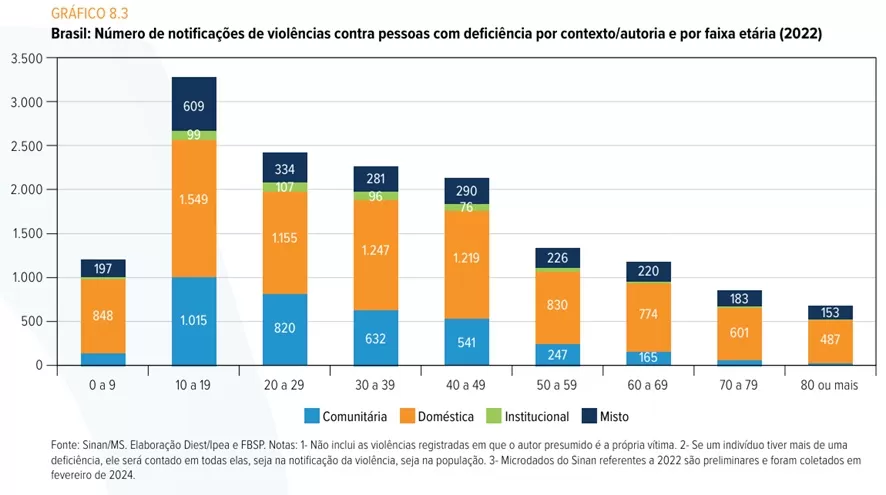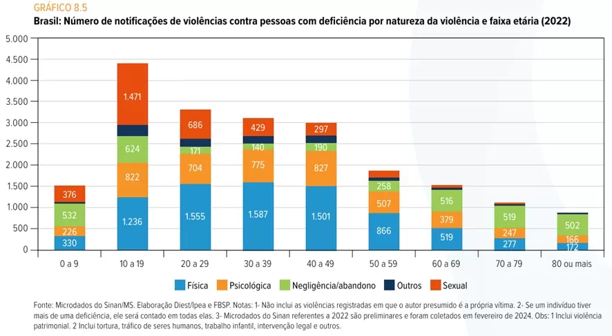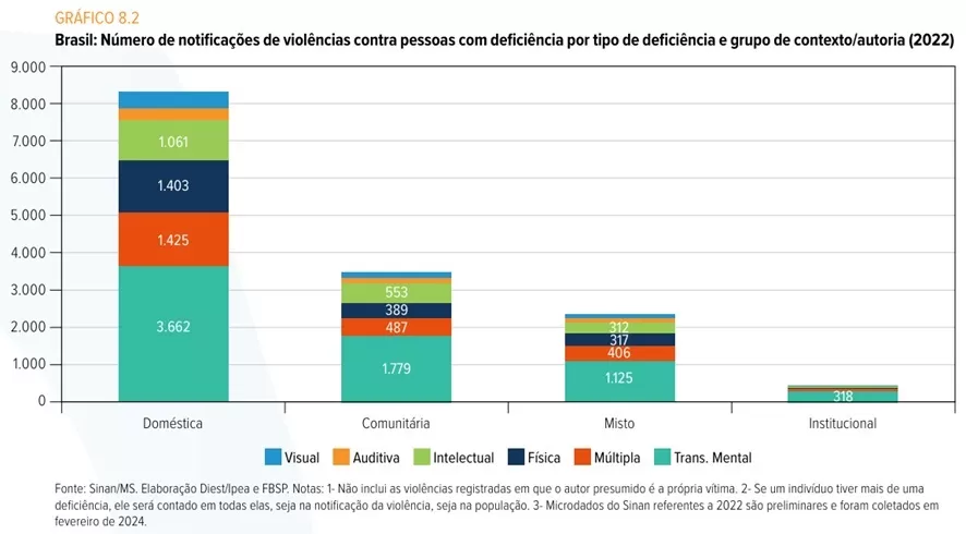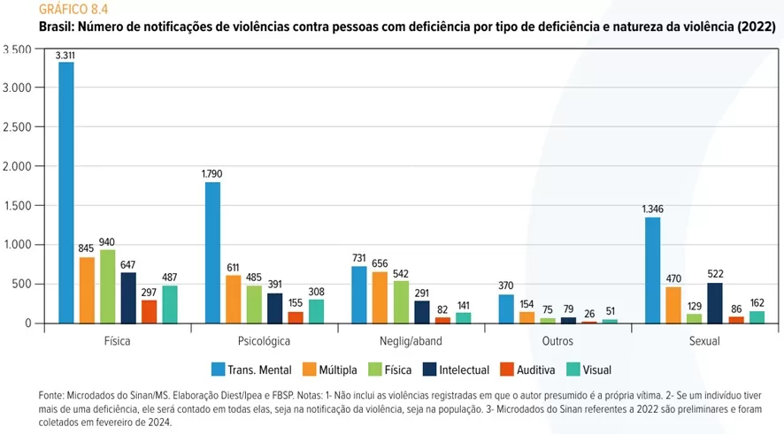 O transtorno mental registrou as taxas mais elevadas de notificações em todas as categorias de violência, sendo a violência física a mais comum nesse grupo, com 60% dos registros. As pessoas com deficiência física foram mais frequentemente alvo de violência física do que de outros tipos, enquanto a violência sexual foi mais registrada entre os grupos de pessoas com deficiência intelectual e múltipla (37% e 25,1%, respectivamente).