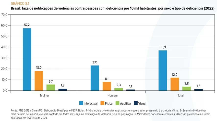 Com base na análise dos dados da saúde pública relacionados à incidência de violência contra pessoas com deficiência no Brasil, percebe-se que as notificações de violência são mais comuns entre mulheres com deficiência do que entre homens na mesma condição, especialmente no que diz respeito à violência sexual e doméstica. Para as mulheres com deficiência, além das formas comuns de violência compartilhadas com mulheres sem deficiência, existem especificidades como isolamento social, dependência de cuidadores e serviços, tipo e grau de funcionalidade da deficiência, e a incapacidade de se defender fisicamente, todos contribuindo para um maior risco de violência (Mello; Nuernberg, 2012).