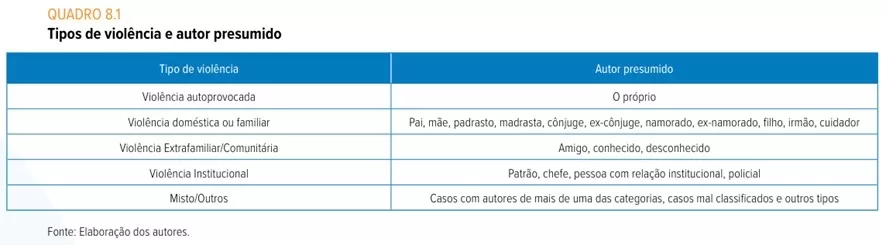 O Quadro 8.1 apresenta cinco grupos de violência, a partir dos autores presumidos no Sinan. Os grupos de “contexto/autoria” foram estabelecidos com base na classificação delineada pelo guia do Ministério da Saúde (Brasil, 2016a), aderindo às definições da Organização Mundial da Saúde (OMS) para três categorias principais de violência: autoprovocada, interpessoal (abrangendo casos domésticos e comunitários) e coletiva. É importante ressaltar que as notificações referentes à violência autoprovocada não foram consideradas, como mencionado anteriormente.