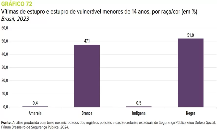 O Anuário vem chamando a atenção para a raça/cor das vítimas. No ano passado, vimos que a maior parte das vítimas era formada por meninas negras. Este ano o dado extraído mostra que as meninas negras continuam sendo as maiores vítimas (51,9%), seguidas por brancas (47,1%), indígenas (0,5%) e amarelas (0,4%).