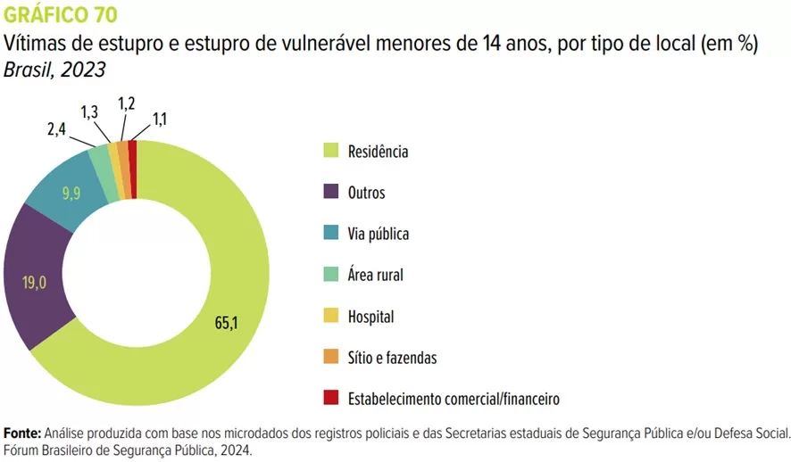 Como nos anos anteriores, a residência continua sendo o local mais perigoso para crianças e adolescentes no que tange à prática de violência sexual. Segundo os registros, 65,1% dos crimes aconteceram dentro de casa, enquanto a via pública é apontada em apenas 9,9% dos casos.