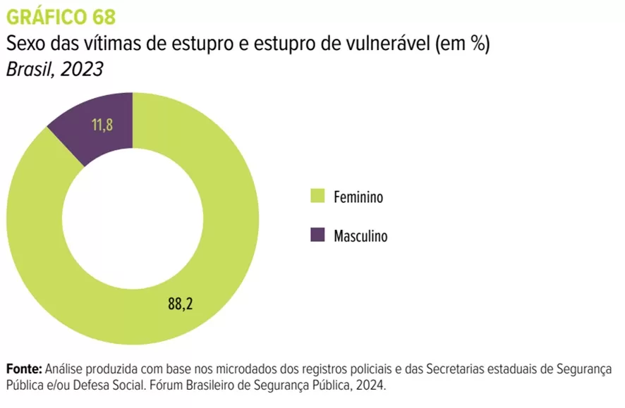 Somados, os registros de estupro e estupro de vulnerável subiram de 78.887 em 2022 para 83.988 em 2023, sendo que 76% desses casos foram de estupro de vulnerável. Não custa relembrar que o estupro de vulnerável se caracteriza não só pela prática de conjunção carnal ou outro tipo de ato libidinoso com menores de 14 anos, mas também com qualquer pessoa que tenha enfermidade ou deficiência mental que impeça o consentimento livre para o ato ou, ainda, com alguém que esteja temporariamente em um estado que não permita o oferecimento de resistência.