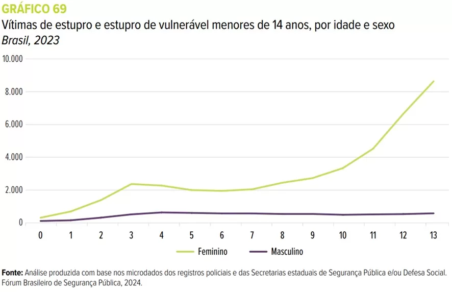 Com o recorte de menores de 14 anos, temos 61,6% dos casos registrados, o que significa mais de cinco estupros de menores de 14 anos registrados por hora no país. Em 88,2% desses registros, a vítima é uma menina. Quanto à idade, as meninas seguem o padrão dos anos anteriores, uma curva crescente de ocorrências que apresenta seu pico aos 13 anos. Quando se observa a idade dos meninos, surge neste ano um dado interessante, e que dá o que pensar. Diferentemente de 2022, quando se observava um pico de estupros contra meninos com idades entre 5 e 9 anos, em 2023 a violência a partir dos 3 anos permanece quase a mesma até os 13 anos.