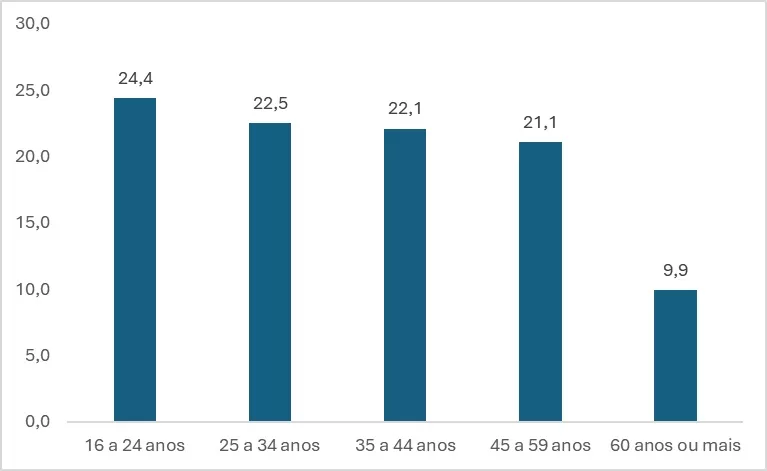 Gráfico 1. Faixa etária dos respondentes que afirmam conhecer mulheres que vivenciaram situação de violência doméstica por parceiro íntimo nos últimos 12 meses, em %.