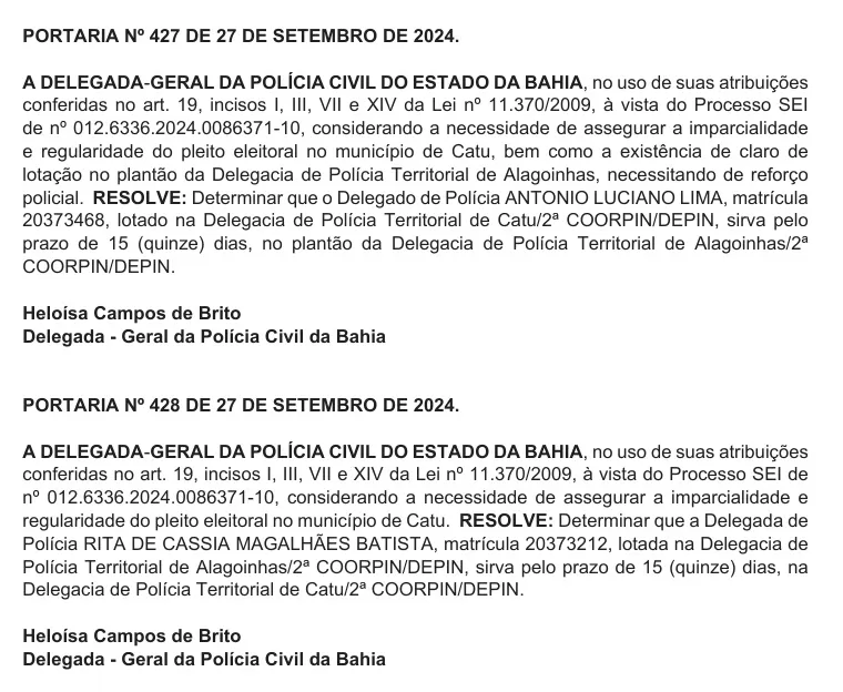 Além do afastamento de Lima, foi publicada no mesmo Diário Oficial a designação da Delegada Rita de Cássia, lotada em Alagoinhas, sede da 2ª Coorpin, para atuar em Catu durante o período eleitoral de 15 dias.