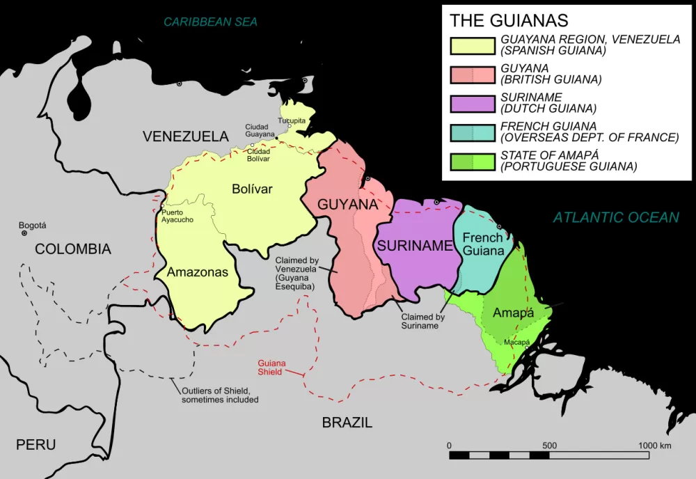 As Guianas, com destaque para o Escudo das Guinas (Guiana Shield) pontilhado em vermelho: