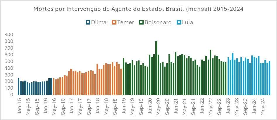 É fundamental reconhecer que, devido ao arranjo institucional da segurança pública no Brasil, o presidente e sua agenda política não são os únicos ou mesmo os principais responsáveis pelas variações nos índices de letalidade policial. No entanto, o contexto político e ideológico no qual atuam desempenha um papel central para entender como as polícias estaduais são empregadas no cotidiano. Desde o governo de Michel Temer, em 2016, o Brasil passou por uma guinada à direita, que fortaleceu pautas de militarização e priorizou o uso da força como solução para a criminalidade. Esse realinhamento político nacional foi fundamental para a manutenção de altas taxas de letalidade policial, especialmente à medida que governadores estaduais, alinhados a essa agenda, adotaram políticas igualmente repressivas em seus estados.