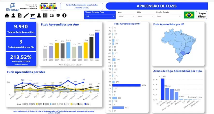 Enquanto isso, o número de rifles de assalto ou fuzis apreendidos no Brasil continua a crescer de forma preocupante. Dados do SINESP (Sistema Nacional de Informações de Segurança Pública), vinculado ao Ministério da Justiça e Segurança Pública, indicam um aumento de mais de 200% nas apreensões desse tipo de arma entre 2015 e 2024. O ano de 2023 registrou o maior número histórico, com 1.358 fuzis apreendidos, marca que já foi superada em 2024, considerando apenas os dados disponíveis até outubro. Nos últimos dez anos, o Rio de Janeiro liderou as apreensões, com mais de 4.500 fuzis confiscados, seguido por São Paulo, com pouco mais de 1.800.