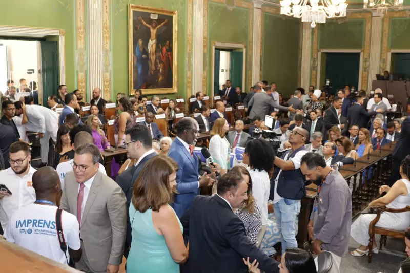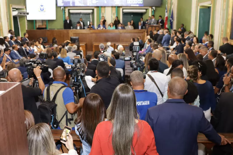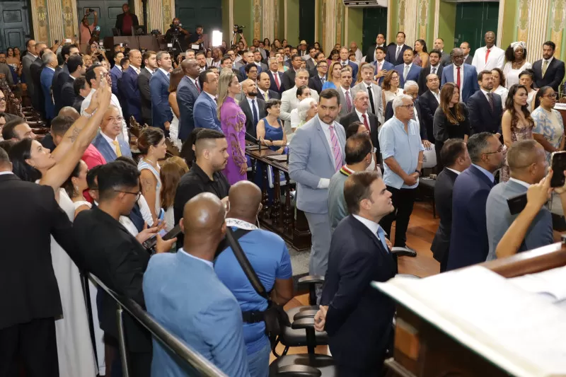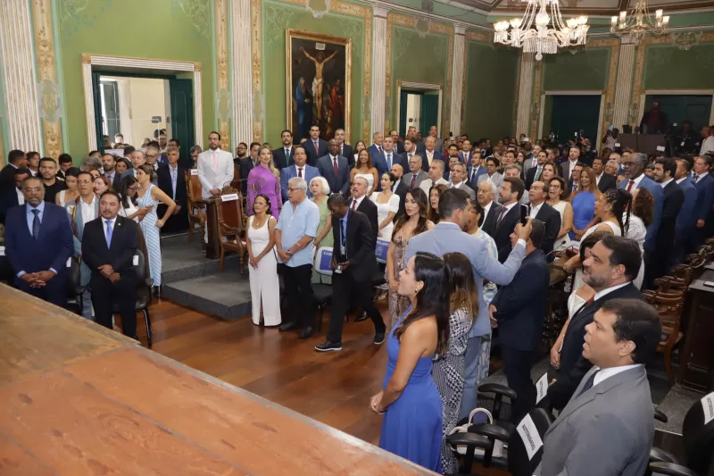 O Plenário Cosme de Farias da Câmara Municipal de Salvador ficou pequeno na tarde desta quarta-feira (1º) durante a solenidade de posse dos 43 vereadores, do prefeito Bruno Reis e da vice-prefeita Ana Paula Matos. A sessão solene foi conduzida pelo vereador Carlos Muniz (PSDB), que ocupou a presidência da Mesa Executiva no período legislativo anterior. O ritual da sessão é definido pelo Regimento Interno da Casa e o encerramento da solenidade formalizou a instalação da 20ª Legislatura.