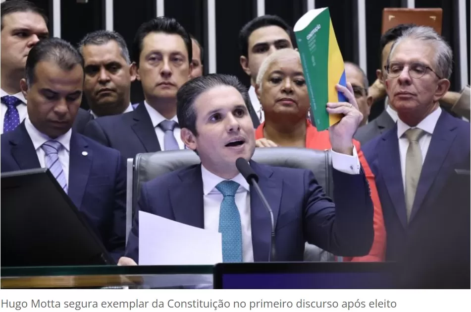 Em seu primeiro discurso como presidente eleito, Hugo Motta fez uma forte defesa da democracia, repetindo o gesto simbólico de Ulysses Guimarães ao levantar a Constituição Federal sob aplausos do Plenário. Ele afirmou que o povo brasileiro não quer discórdia, mas emprego, e que os Poderes devem lutar pelo bem comum, e não pelo poder em si. "Não há ninguém acima da democracia", declarou, reforçando seu compromisso com o regime democrático.