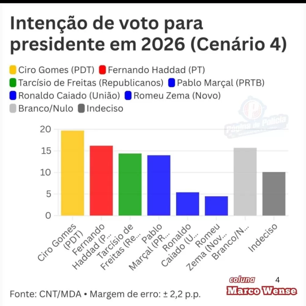 Veja abaixo a última pesquisa da CNT/MDA com margem de erro de 2,2 p.p. O candidato do PT é Haddad. Ciro Gomes (PDT) é o primeiro colocado. Vira pesadelo o PT sair vitorioso no pleito de 2026 com Haddad ou outro petista.