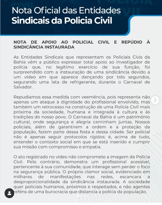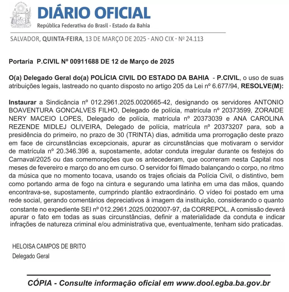 A reação ao vídeo, no entanto, foi contraditória. Enquanto a Secretaria de Segurança Pública da Bahia (SSP-BA) compartilhou as imagens em seu perfil oficial, elogiando a interação entre policiais e foliões durante o evento, a Polícia Civil tomou uma decisão oposta. No dia 13 de março de 2025, foi publicada no Diário Oficial do Estado a Portaria POLÍCIA CIVIL Nº 00911688, assinada pela Delegada Geral Heloísa Campos de Brito, instaurando uma sindicância para apurar a conduta do policial.