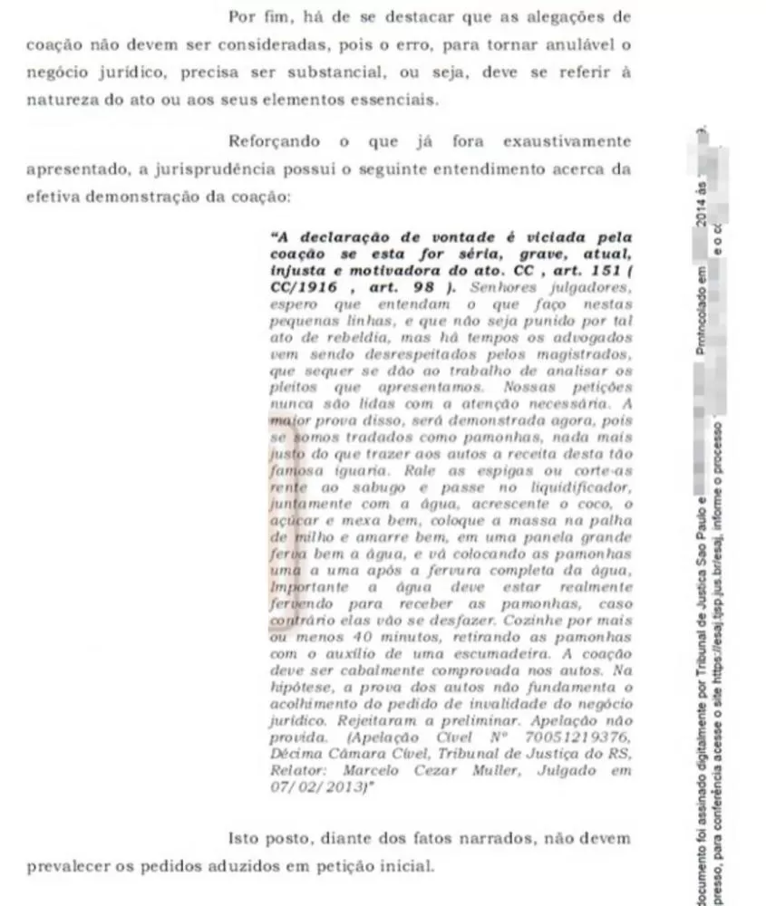 A atenção e o cuidado na análise dos autos processuais são fundamentais para a correta prestação jurisdicional. No entanto, um advogado brasileiro, insatisfeito com a forma superficial como as petições são tratadas, decidiu demonstrar esse problema de maneira inusitada: incluiu, no meio de um documento judicial, uma receita completa de pamonha, detalhando desde o preparo das espigas de milho até o cozimento da massa. O resultado? O texto passou despercebido pelo magistrado responsável, reforçando as críticas sobre a falta de atenção na leitura das petições.