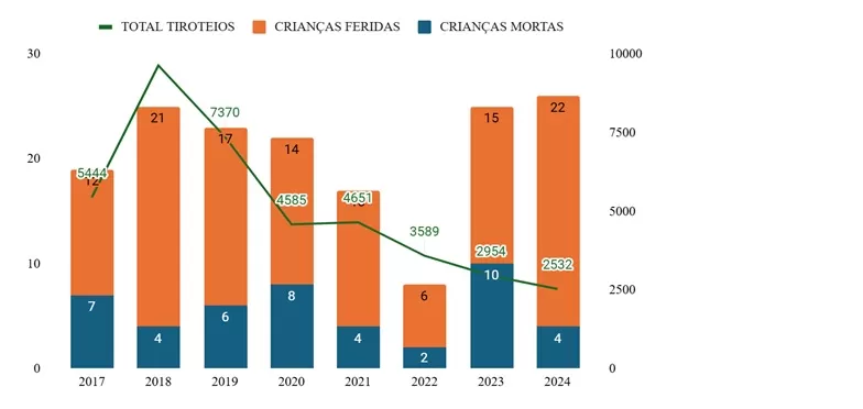 GRÁFICO. Evolução de tiroteios e crianças baleadas (2017–2024)