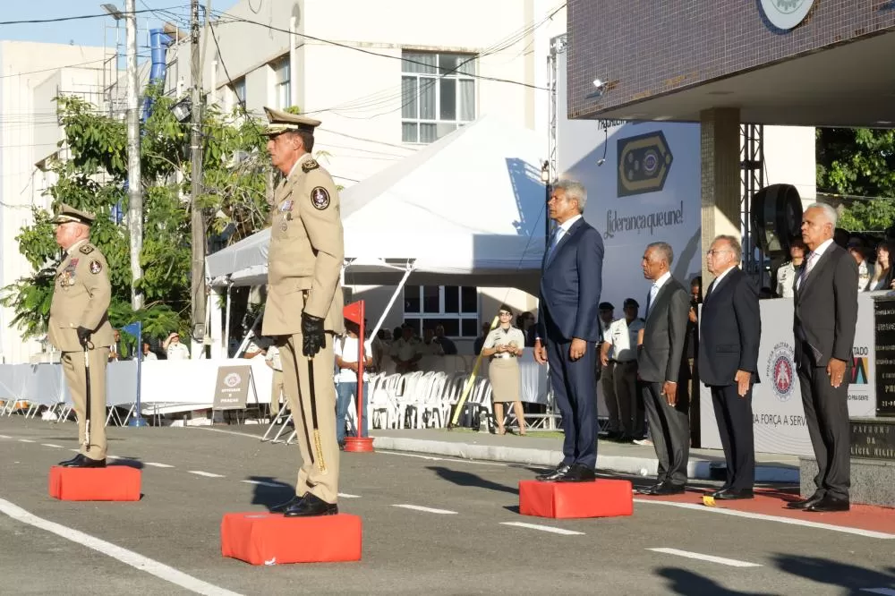 A solenidade que marcou o início da gestão do 65º comandante-geral da Polícia Militar teve a participação do governador do estado, Jerônimo Rodrigues, do vice-governador, Geraldo, do secretário da segurança pública, Marcelo Werner, e de autoridades civis e militares.