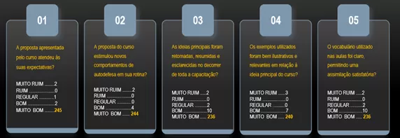 Como forma de promover o feedback para as adequações técnicas necessárias às edições subsequentes, foi elaborado o questionário constituído por dez questões objetivas e uma questão subjetiva, que foi respondido por 250 profissionais de segurança pública que participaram da referida capacitação, entre os anos de 2019 e 2023.