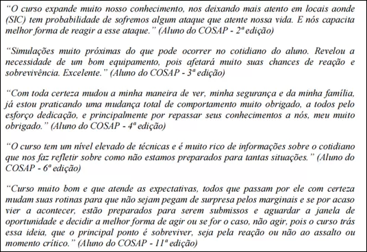Pelas respostas dos quesitos objetivos (Quadro 2), a maioria dos respondentes confirma a aplicabilidade prática do conhecimento e das técnicas do COSAP em suas rotinas, permitindo-se constatar a mudança de percepção sobre a conduta de autoproteção desses agentes.
