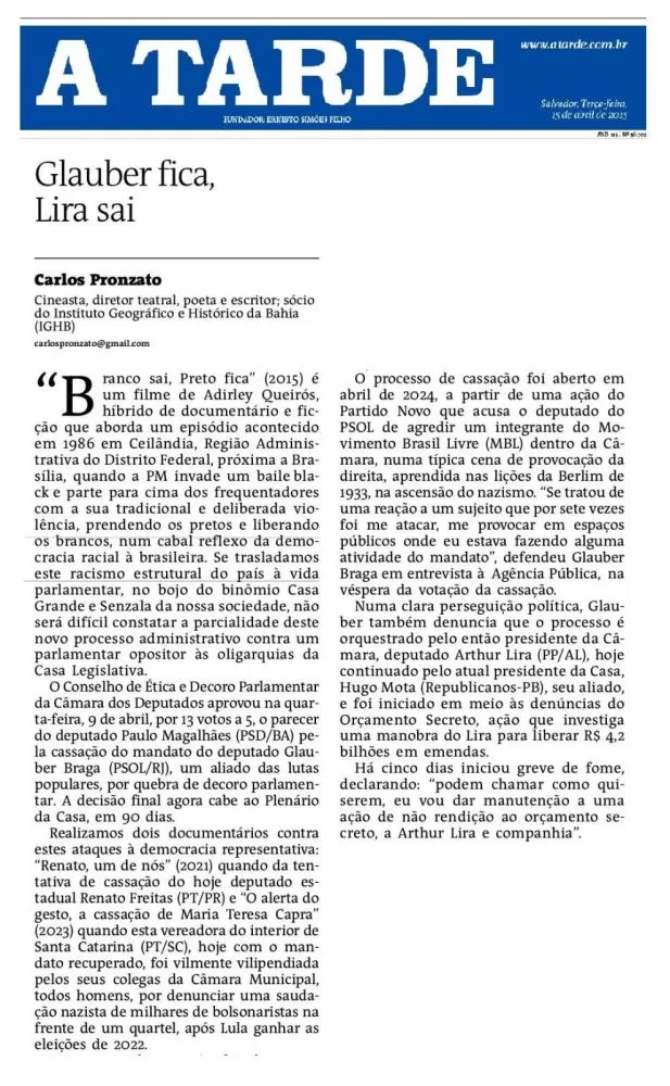 O Conselho de Ética e Decoro Parlamentar da Câmara dos Deputados aprovou na quarta-feira, 9 de abril, por 13 votos a 5, o parecer do deputado Paulo Magalhães (PSD/BA) pela cassação do mandato do deputado Glauber Braga (PSOL/RJ), um aliado das lutas populares, por quebra de decoro parlamentar. A decisão final agora cabe ao Plenário da Casa, em 90 dias.