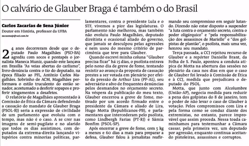 O relatório de Magalhães apresentado à Comissão de Ética da Câmara defendendo a cassação do mandato de Glauber Braga (PSOL-RJ) seria a expressão de civilidade de um parlamento que evoluiu com o tempo, mas não é o caso. A se crer nas imagens de semi-pugilato e no alarido que todos os dias assistimos, com deputados da extrema-direita lançando vitupérios contra minorias políticas, parlamentares, contra o presidente Lula e o STF, vivemos a pior das legislaturas. O parlamento não melhorou, mas também não evoluiu Paulo Magalhães, deputado direitista e ocasional aliado do governo, que jamais se desculpou pelas agressões e nem usou do mesmo critério de parcimônia que teve para Glauber.