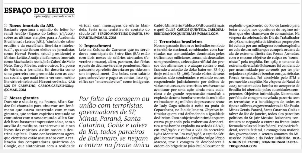 (*) Publicado no Jornal A Tarde, (Espaço do Leitor), edição de 06.05.2025.