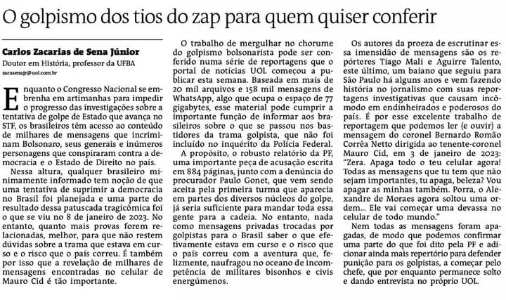 Os autores da proeza de escrutinar essa imensidão de mensagens são os repórteres Tiago Mali e Aguirre Talento, este último, um baiano que seguiu para São Paulo há alguns anos e vem fazendo história no jornalismo com suas reportagens investigativas que causam incômodo em endinheirados e poderosos do país. É por esse excelente trabalho de reportagem que podemos ler (e ouvir) a mensagem do coronel Bernardo Romão Corrêa Netto dirigida ao tenente-coronel Mauro Cid, em 3 de janeiro de 2023: “Zera. Apaga todo o teu celular agora! Todas as mensagens que tu tem que não sejam importantes, tu apaga, beleza? Vou apagar as minhas também. Porra, o Alexandre de Moraes agora soltou uma ordem... Ele vai começar uma devassa no celular de todo mundo.”
