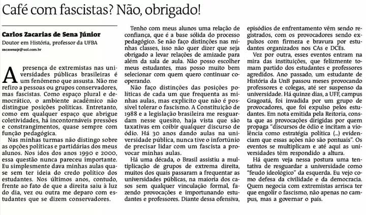 Não faço distinções das posições políticas de cada um que frequenta as minhas aulas, mas explicito que não é possível tolerar o fascismo. A Constituição de 1988 e a legislação brasileira me resguardam nesse quesito, haja vista que são taxativas em coibir qualquer discurso de ódio. Há 30 anos dando aulas na universidade pública, nunca tive o infortúnio de precisar lidar com um fascista a provocar minhas aulas.