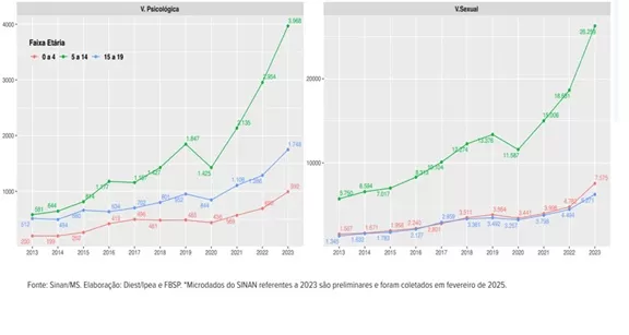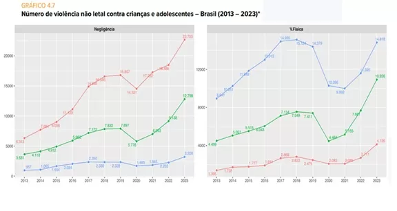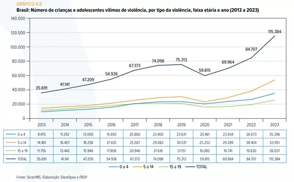 No ano seguinte, no entanto, os números retomam o ritmo de crescimento verificado no período anterior à pandemia, com 69.964 registros de violências física, sexual, psicológica e negligência em 2021 e 84.707 registros em 2022, aumento de 21% no período. Em 2023, outro crescimento ocorreu, muito acima da média histórica, com ampliação de 36,2%, atingindo o recorde de 115.384 registros. Desse total, 35.396 foram de crianças de 0 a 4 anos, crescimento de 32,7% em relação ao ano anterior. Na faixa etária de 5 a 14 anos foram 53.951 registros, aumento de 40,5% em relação a 2022. Já entre os adolescentes de 15 a 19 anos foram 26.037 registros dos quatro tipos de violência, aumento de 32,6%.