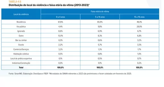A Tabela 4.6 apresenta a distribuição do local de ocorrência das violências contra crianças e adolescentes notificadas entre 2013 e 2023. No caso de infantes (0 a 4 anos) e crianças (5 a 14 anos), a residência aparece como local majoritário das ocorrências, constando respectivamente em 67,8% e 65,9% das notificações. A violência ocorrida em escolas é mais comum entre crianças (5,7%), tornando-se preocupantes dados sobre possíveis impactos no desenvolvimento educacional. Devemos notar, contudo, que existe uma proporção significativa de notificações em que há pouca informação sobre o local de ocorrência (local ignorado ou outro). No caso de crianças, em 15,2% das notificações não é possível conhecer o local de ocorrência da violência, destacando o imperativo de aperfeiçoar a coleta e o detalhamento de informações na notificação. No caso de adolescentes, embora residência permaneça como o local de ocorrência de maior frequência (48,4%), violências em via pública representam 28% das notificações, sugerindo diferenciada dinâmica de violência com o passar de idade.