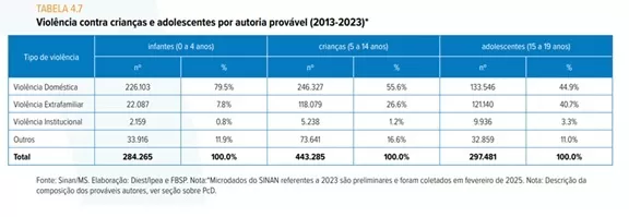 Dado que a residência é o local mais comum de ocorrência de violência contra crianças e adolescentes, é natural esperar a violência familiar como fenômeno de maior frequência. Isso é confirmado pelos dados da Tabela 4.7, que detalham a violência contra crianças e adolescentes por agressor.[1] Assim, em todas as faixas etárias a violência familiar é o tipo prevalente.