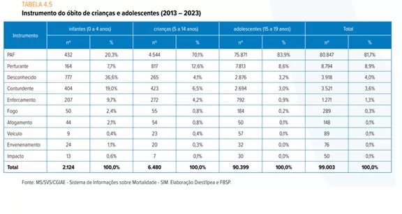 Conhecida a dinâmica temporal dos homicídios contra infantes, crianças e adolescentes, o instrumento causador do óbito aparece como variável de interesse na elaboração de políticas públicas. De acordo com a Tabela 4.5, em todas as faixas etárias, arma de fogo aparece como instrumento conhecido de maior frequência nos homicídios. Com efeito, 83,9% dos adolescentes (15 a 19 anos) e 70,1% das crianças (5 a 14 anos) foram vitimizados com o uso da arma de fogo. Em relação às vítimas infantes (0 a 4 anos), instrumentos desconhecidos aparecem com maior frequência, sinalizando inadequado preenchimento da informação instrumento na declaração de óbito.