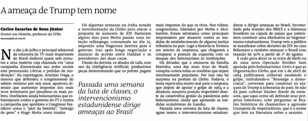 (*) Publicado no Jornal A Tarde, (Espaço do Leitor), edição de 11.07.2025