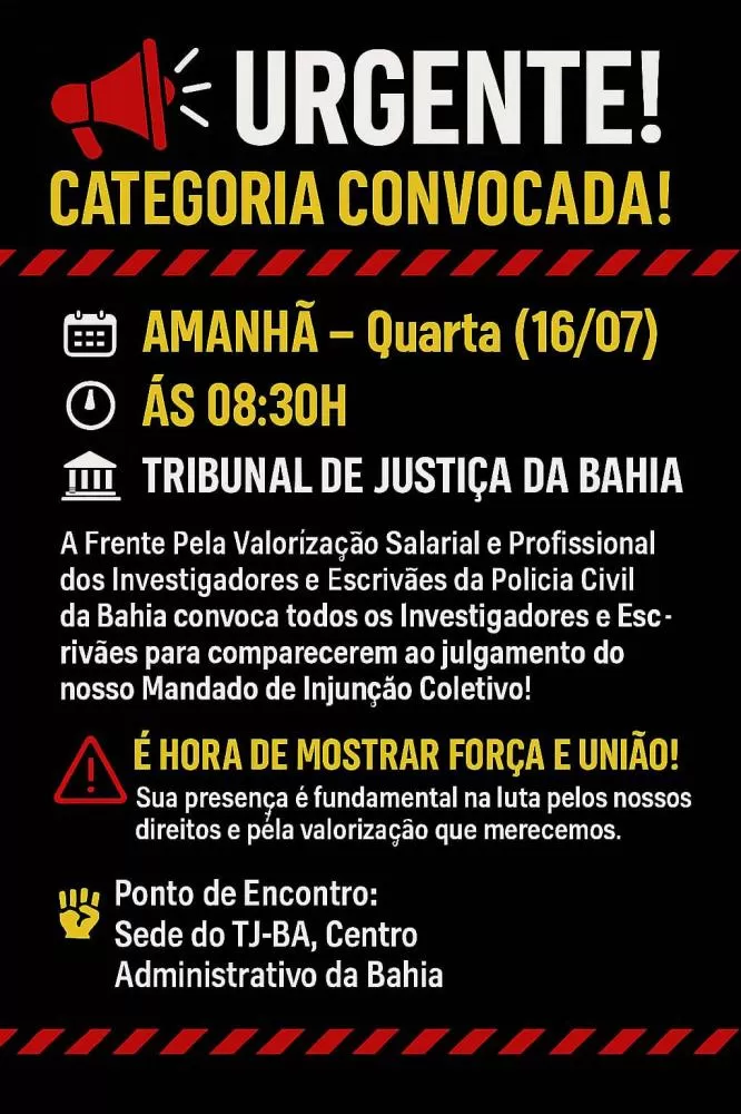 A situação revoltou a base da categoria, que tem acompanhado com ansiedade cada capítulo dessa história com apreensão e desconfiança. Durante a última sessão, vários policiais civis de Salvador, Região Metropolitana e interior do estado marcaram presença no Tribunal de Justiça da Bahia (TJ-BA), alguns trajando camisas pretas como símbolo de unidade e resistência.