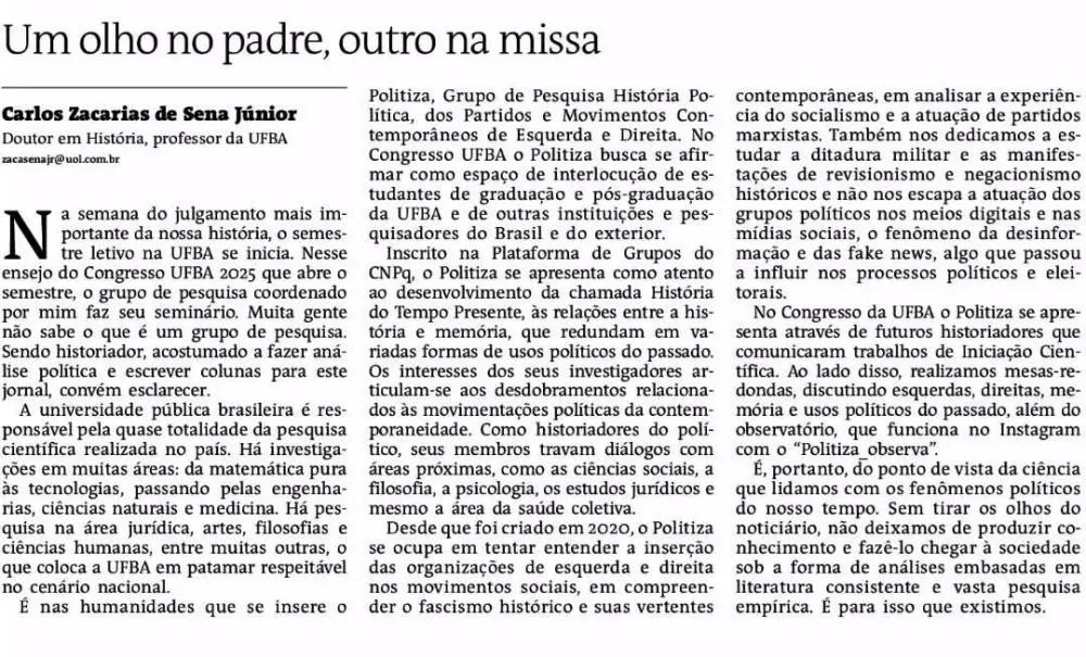 Na semana do julgamento mais importante da nossa história, o semestre letivo na UFBA se inicia. Nesse ensejo do Congresso UFBA 2025 que abre o semestre, o grupo de pesquisa coordenado por mim faz seu seminário. Muita gente não sabe o que é um grupo de pesquisa. Sendo historiador, acostumado a fazer análise política e escrever colunas para este jornal, convém esclarecer.